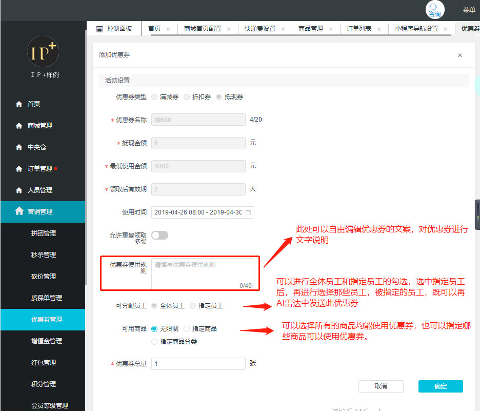 优惠券的生效层级是在所有的活动折扣之后最后生效,如果有金额限制才能使用优惠券,满足金额的条件为折扣前的价格,只要折扣前的价格足够,即可使用优惠券。优惠券分为满减、折扣和抵现,商户需要设置其最低使用金额,并设置其可用时间。优惠券分配的员工只影响员工在AI雷达给客户发送优惠券的时候,不影响客户在商城领取优惠券。