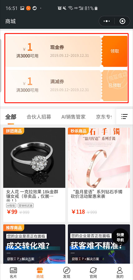 在【商城管理】——【商城首页配置】中,选择左侧的【优惠券】模块,拖拽到中间区域。