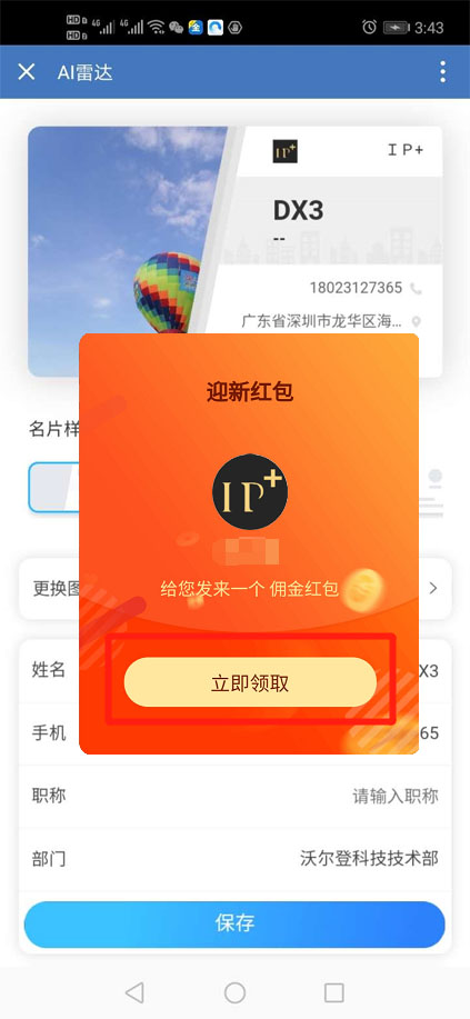 客户进入商户名片后,红包会悬浮在咨询按钮上方,用户领取后将不会再显示。每个用户只能领取一次,且领取红包必须