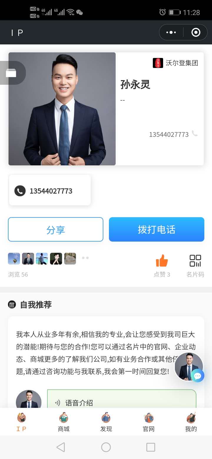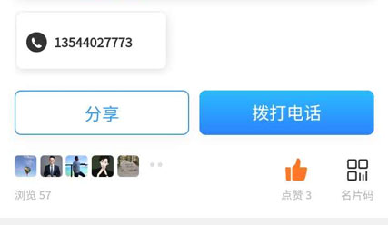 进入名片后,点击下方的【分享名片】,可进行名片的转发或者生成名片海报。因为小程序本身是不支持直接转发到朋友圈的,这时可以生成名片海报保存下来,再通过图片海报发到朋友圈中。