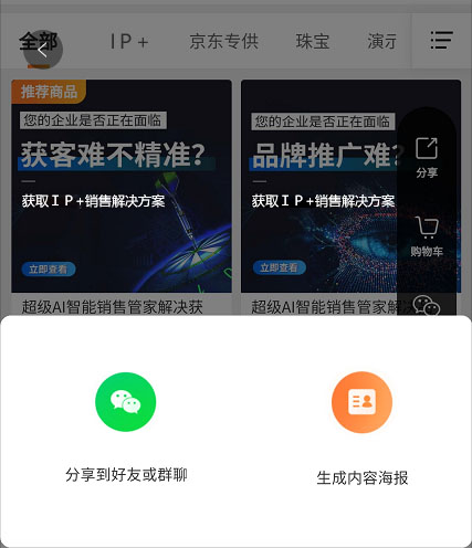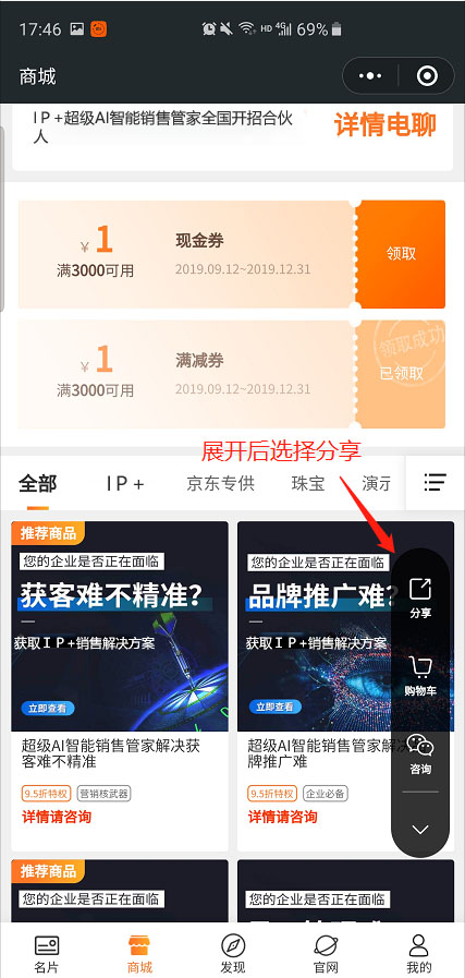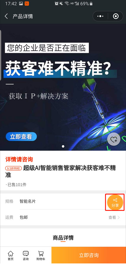 在商城中,找到一个商品进入商品详情页,点击右侧的【分享】按钮,就可以进行分享了。