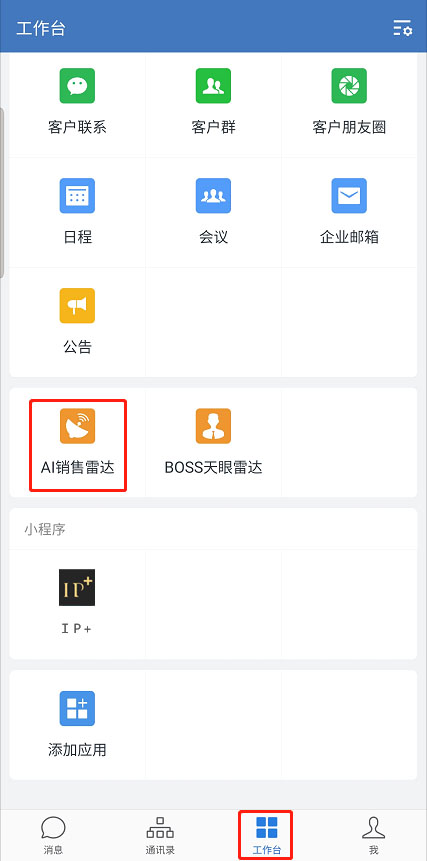 首先进入企业微信,依次点击【工作台】-【AI雷达】-【我】-【名片海报】,最后长按识别进入。
