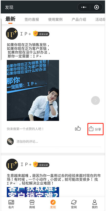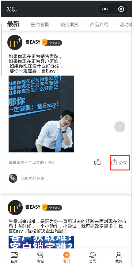 小程序后,点击底部导航【发现】,找到想要分享的动态,点击分享。