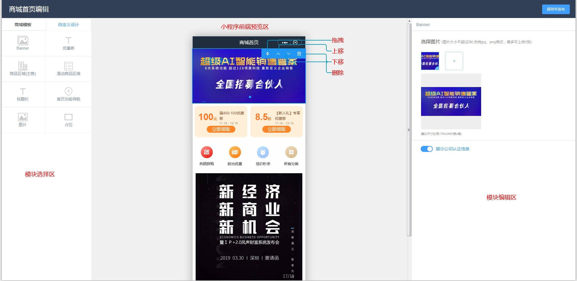 经过多次优化后再商城首页配置的地方可以放置单张图片,尺寸不限,并且可以链接商品和商品分类以及积分商城。