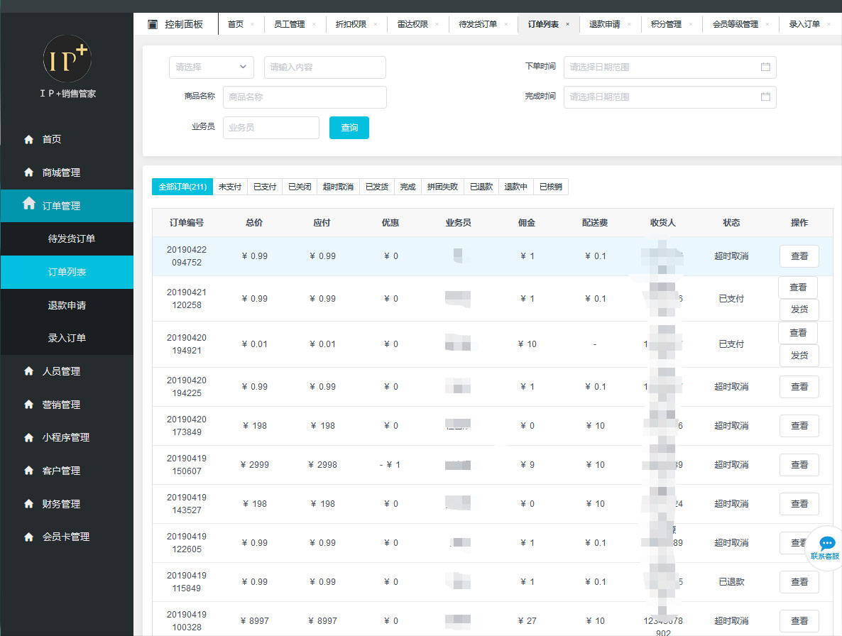这里显示平台的所有订单。上方可以根据不同的条件筛选订单。也可以通过订单的不同状态进行筛选。点击查看按钮可以查看订单的详细信息,查看订单的分销人员。点击发货,填写物流信息,可以选择无需物流。
