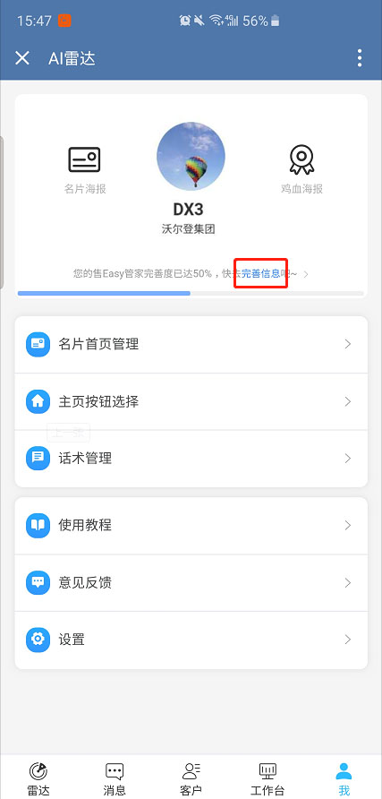 点击进入AI雷达,在底部导航栏点击【我】编辑各项个人信息。