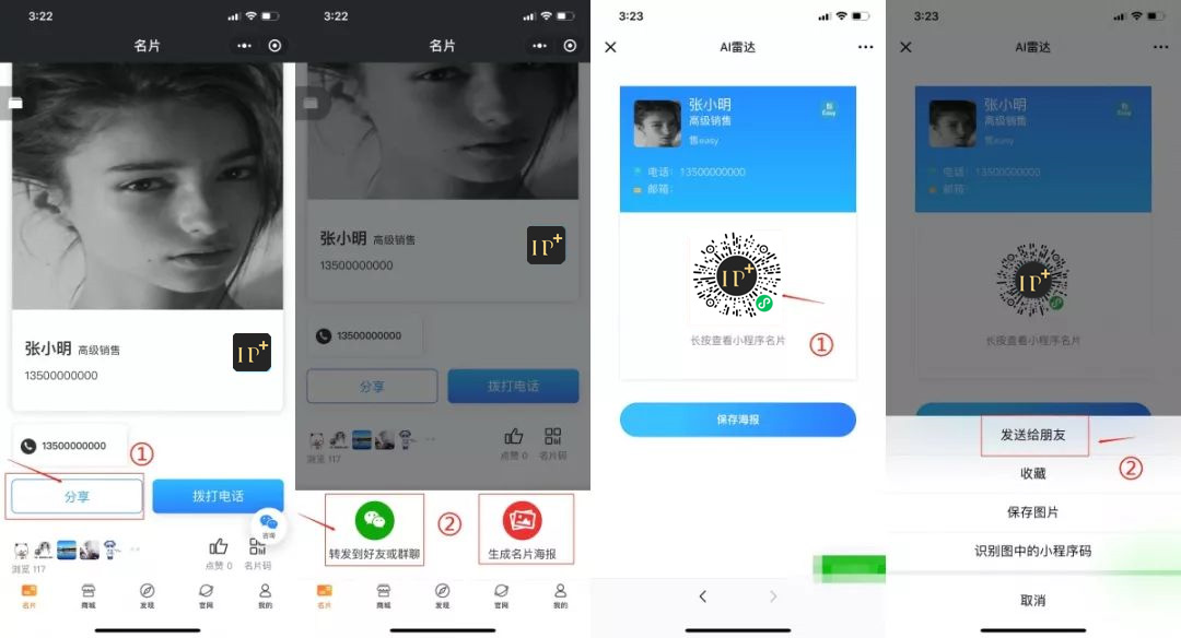 在小程序的任何页面,都可以点击右上角三个点或者页面内的分享按钮,然后一对一的形式转发到微信好友或者微信群内;转发到微信群内的信息可以快速提取该群的群员对你感兴趣的人都有哪些,只要一进入就会触发雷达实时监测。