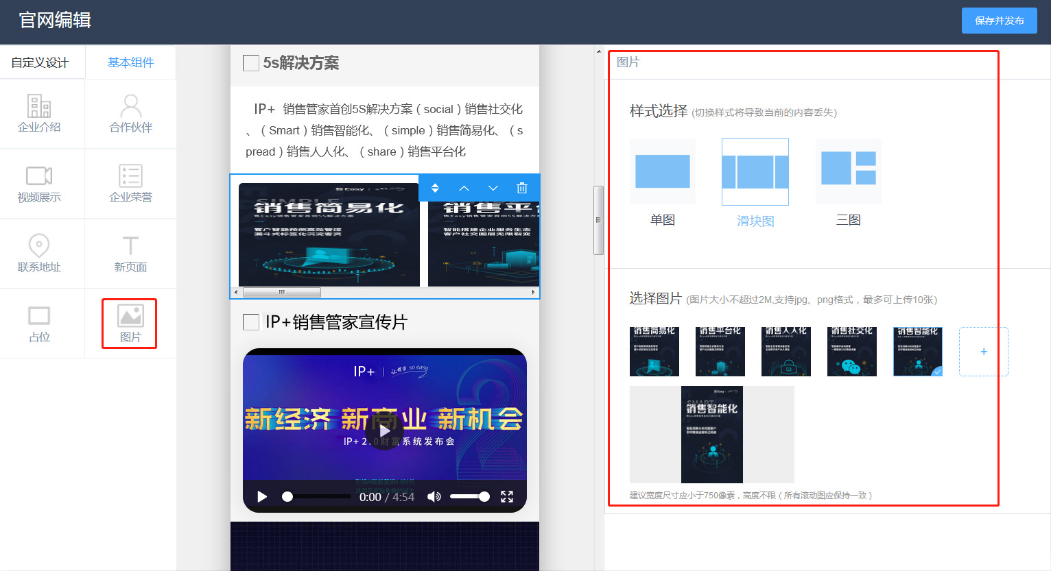 图片模块有三种样式可供选择,单图、滑块图和三图,图片模块自适应上传图片的比例。滑动图片与轮播图不同,在前端需要客户手动滑动图片。
