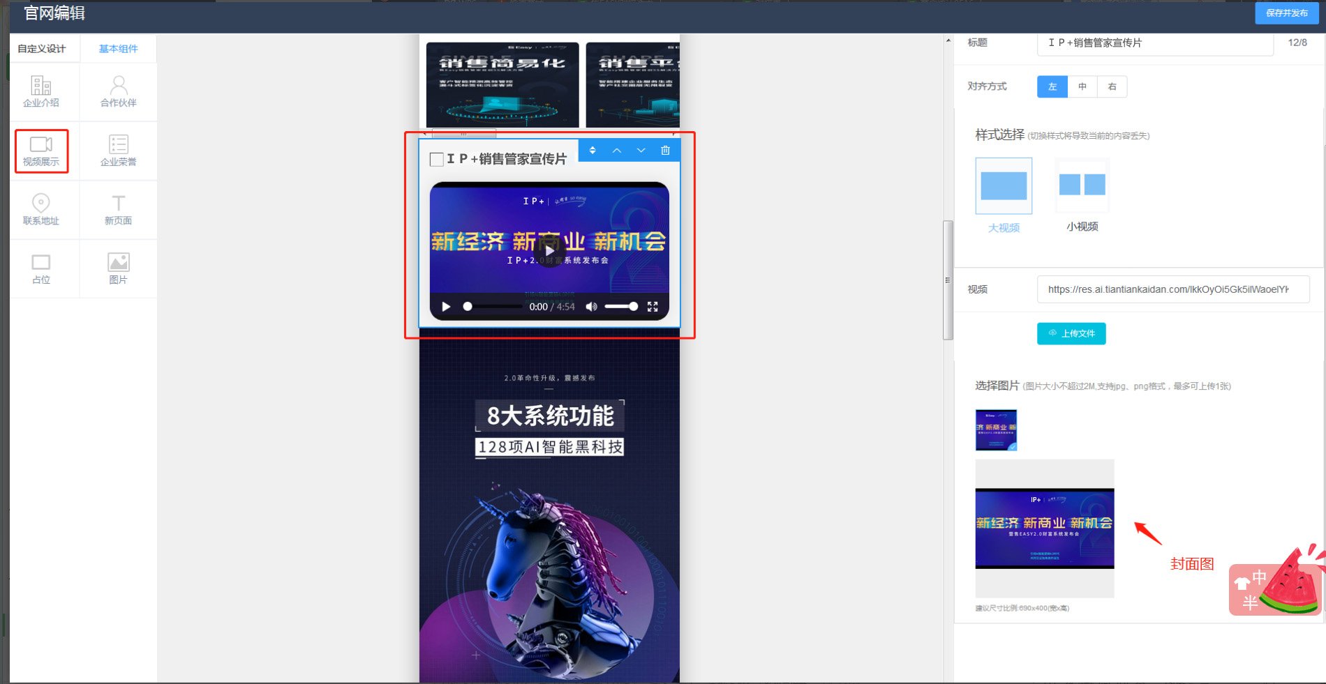 选择【视频展示】模块,点击右侧编辑区,设置视频标题,点击上传文件上传视频,最后设置一下视频封面图。