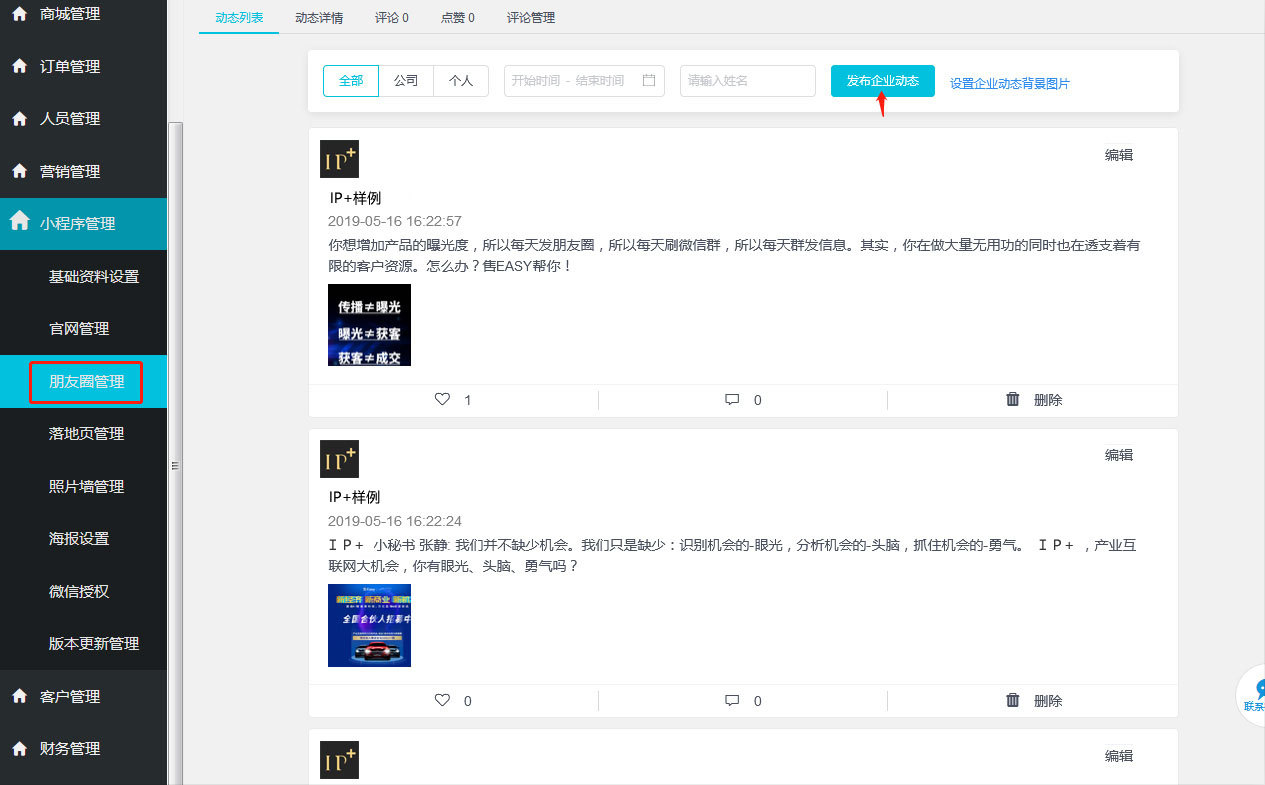 小程序管理】-【朋友圈管理】中,点击【发布企业动态】进行编写。发布成功的企业动态,将在所有员工名片中显示。