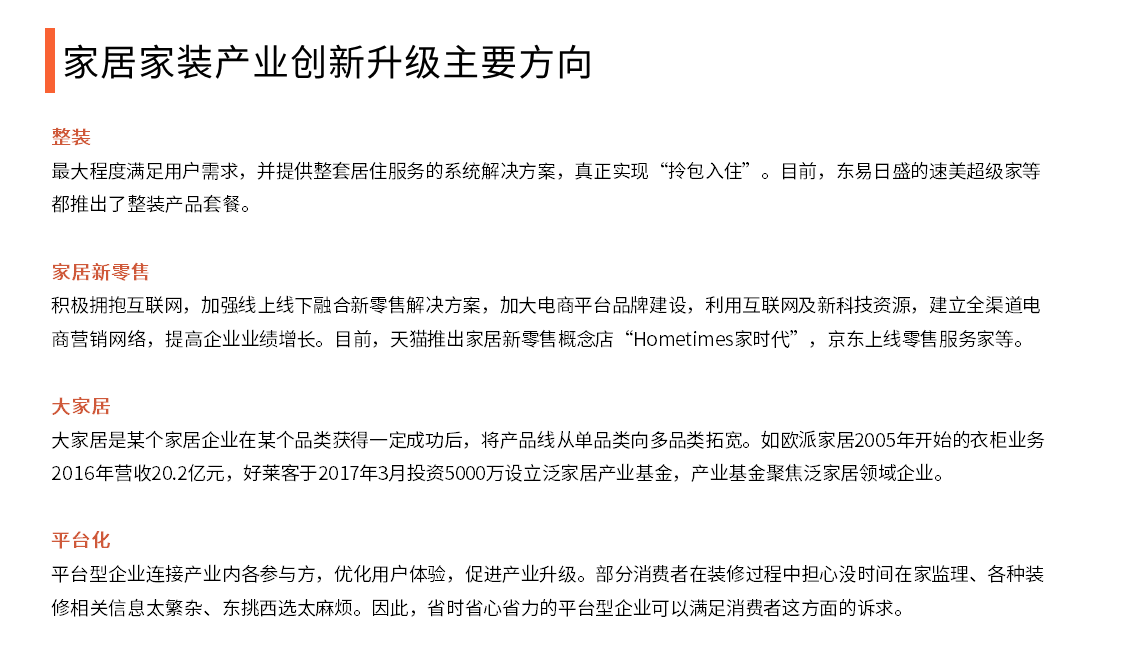 面对家居家装企业痛点和消费者诉求,需要大的平台型企业来帮助赋能和满足。大平台可以通过自身擅长的数据、技术等优势赋能中小企业,让中小企业专注自身擅长的事情,然后通过资源整合,优化企业生产和服务流程,提升效率,最终实现推动家居家装产业规范化。平台型企业可以协同中小企业共同服务消费者,为消费者提供一站式家居家装商品、服务和装修保障,解决信息不对称,降低决策成本。