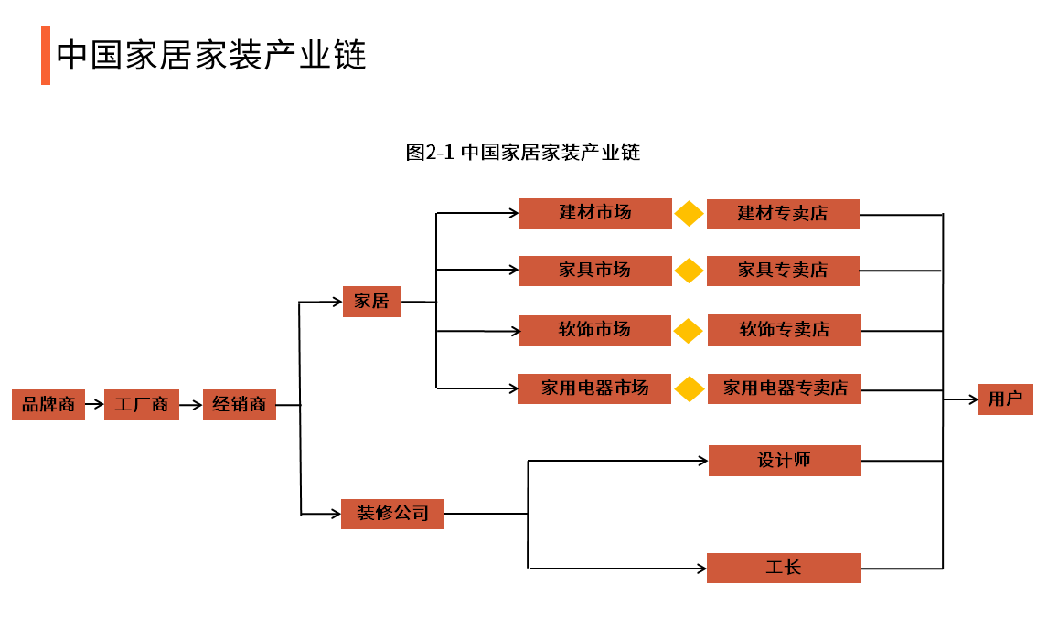 家居家装市场现有产业链参与者包括品牌商、工厂、家居专卖店市场、装修公司、设计师、工长和家居家装用户等。