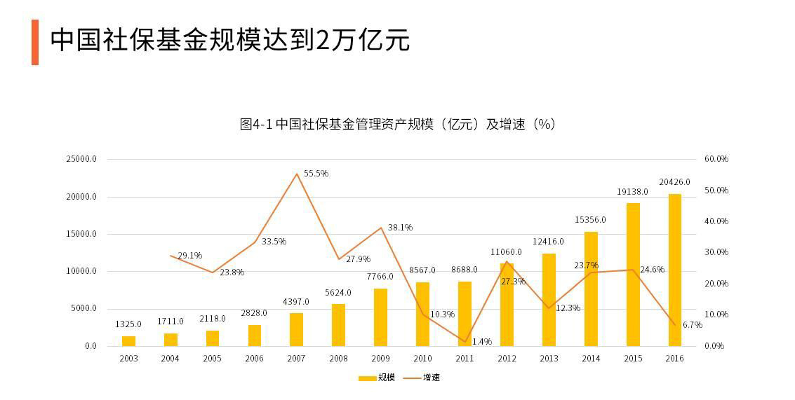 经过15年发展,2016年底,社保基金管理的资产总额为20423亿元。其中,基金权益19488.1亿元。在基金权益总额中,全国社保基金权益16042.6亿元,个人账户基金权益1181.5亿元,地方委托资金权益2264亿元。这是中国社保基金首次突破2万亿元大关,为应对老龄化高峰期养老金支出奠定了基础。