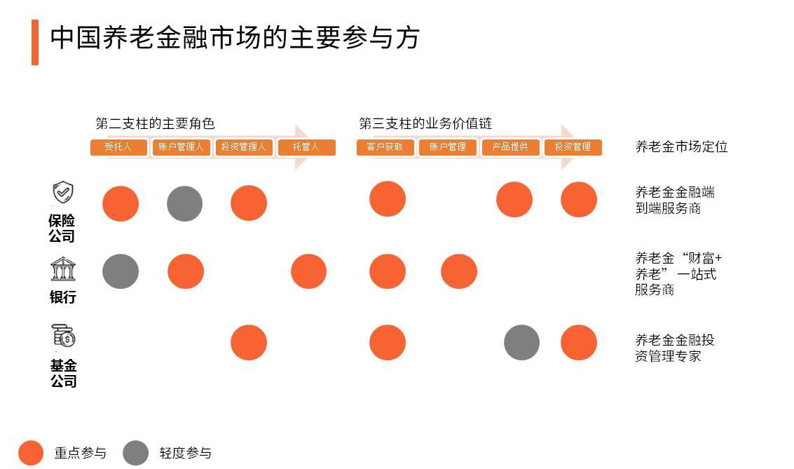 商业养老离不开商业机构,各类型商业机构已通过不同角色定位切入商业养老金融市场。中国第二支柱年金业务采取牌照准入制,在受托机制下获得准入资格的各类金融机构各司其职。