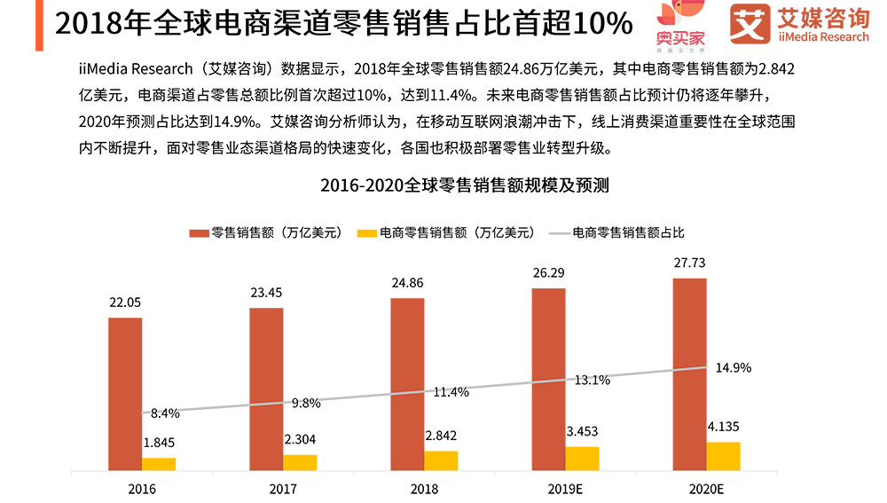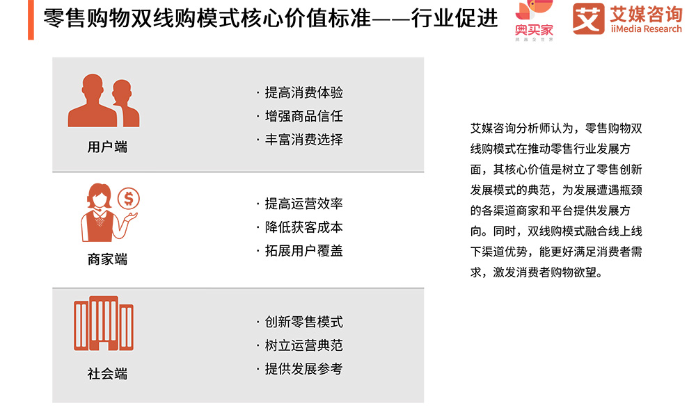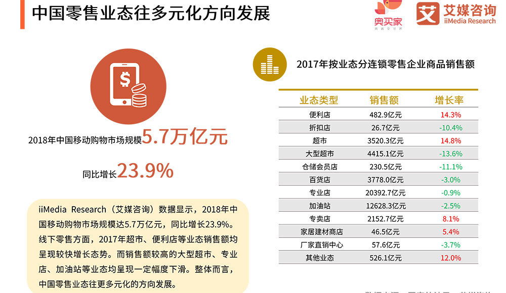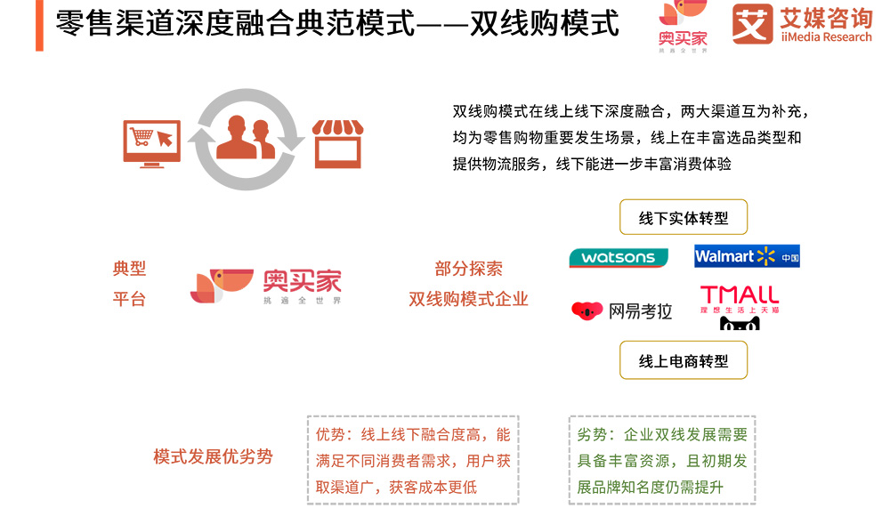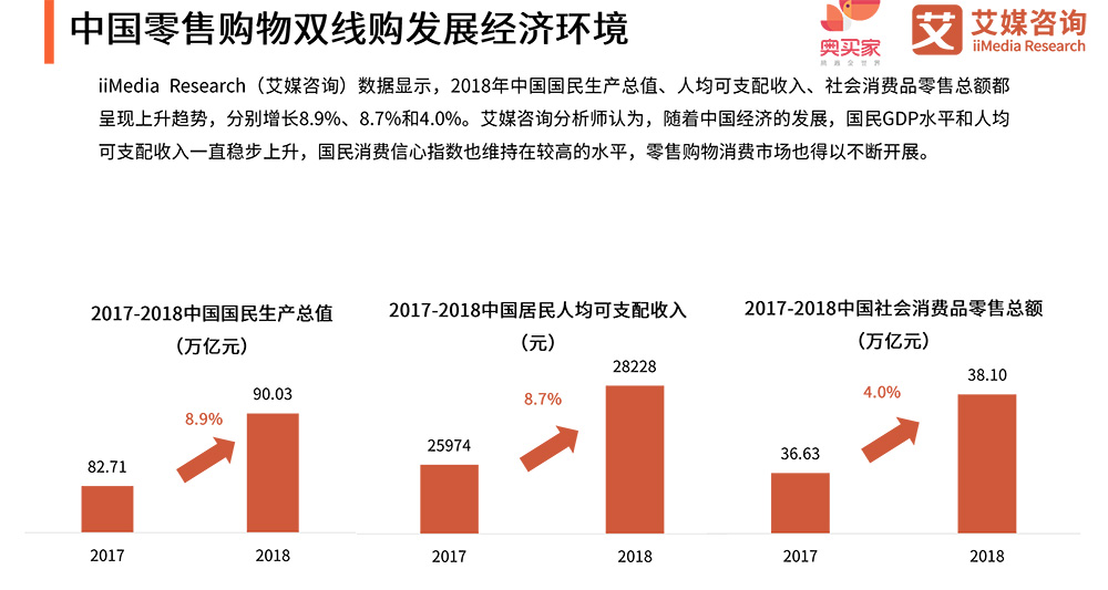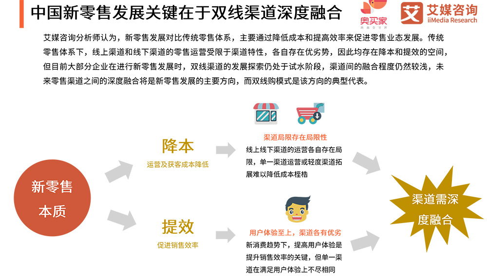 摘要:规模总额再创新高,零售购物产业发展空间巨大。2018年全球零售销售额达到27.73万亿美元,中国社会消费品零售总额增至38.1万亿元,2020年有望突破40万亿元。零售业态呈多元化发展,双线购打造零售渠道创新形态。2018年中国移动购物市场同比增长23.9%,线下零售业态中超市、便利店等业态销售额均呈现较快增长态势。在零售业态多元发展的背景下,深化线上线下渠道融合发展,迎合线上、线下企业转型及消费升级需求变化的双线购模式发展潜力巨大。渠道优势差异造消费行为分化,融合全渠道优势零售模式受期待。超五成消费者认可线上渠道价格低廉和购物方便优势,而线下渠道品质保障和购物体验提升则更受认可。优势差异造成线上线下消费者行为差异明显,线上消费更高频低价、线下消费更低频高价。渠道差异下,消费者期待融合全渠道优势的双线购平台出现,接近七成消费者表示未来愿意尝试使用双线购平台。