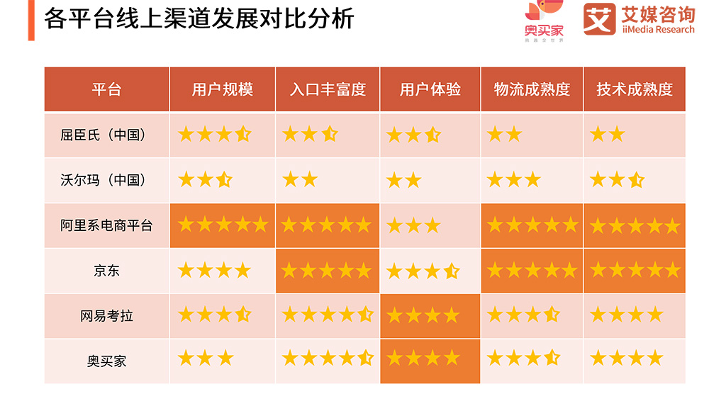 根据2019年3月中国电商平台用户口碑排行榜,苏宁易购、网易考拉和蘑菇街分别获得第一、二、三名,用户口碑指数分别是71.11、60.89、53.09,用户评价较高。
