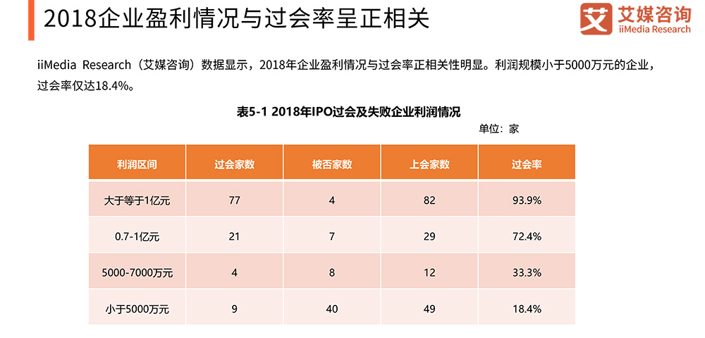 :1、1PO申报企业数量有望增加,过会率及过会企业数量有望小幅回升2018年企业IPO平均过会率为65.3%,按当前发审监管思路,IPO“堰塞湖”问题在2019年将不会再现。相关机构预测2019年的平均过会率将在70%-75%,这是既符合金融市场新常态下监管从严的监管要求又贴近市场预期的平衡点。2019全年有望实现过会企业数量120-150家。2、过会企业净利润最低规模将维持高位2018年利润规模小于5000万元的企业过会率仅为18.37%,而大于1亿元的企业过会率仅为93.9%,由此不难看出IPO过会企业净利润最低规模要求已实质性提高。未来,利润规模较小的企业实现IPO过会的几率将更低。