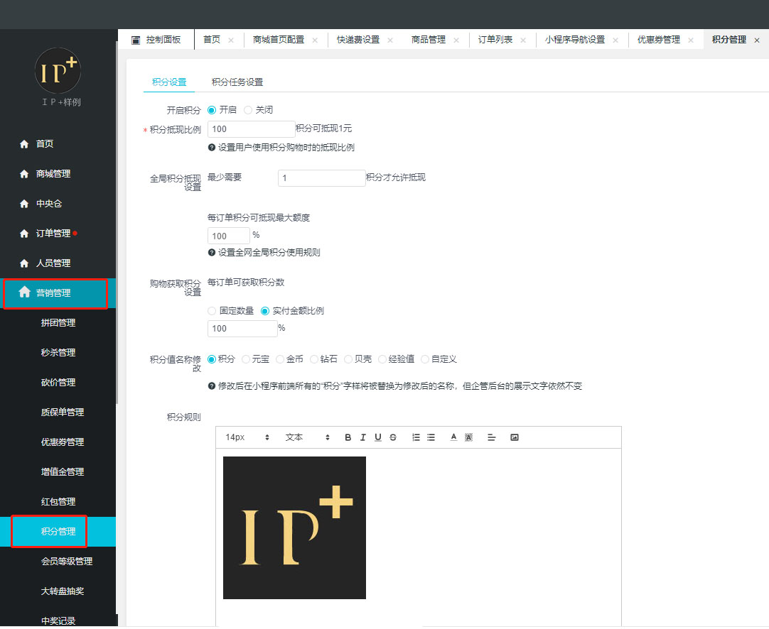 最後可以對積分的規則進行文案説明,可以自由編輯文字和圖片,併具有排版功能。