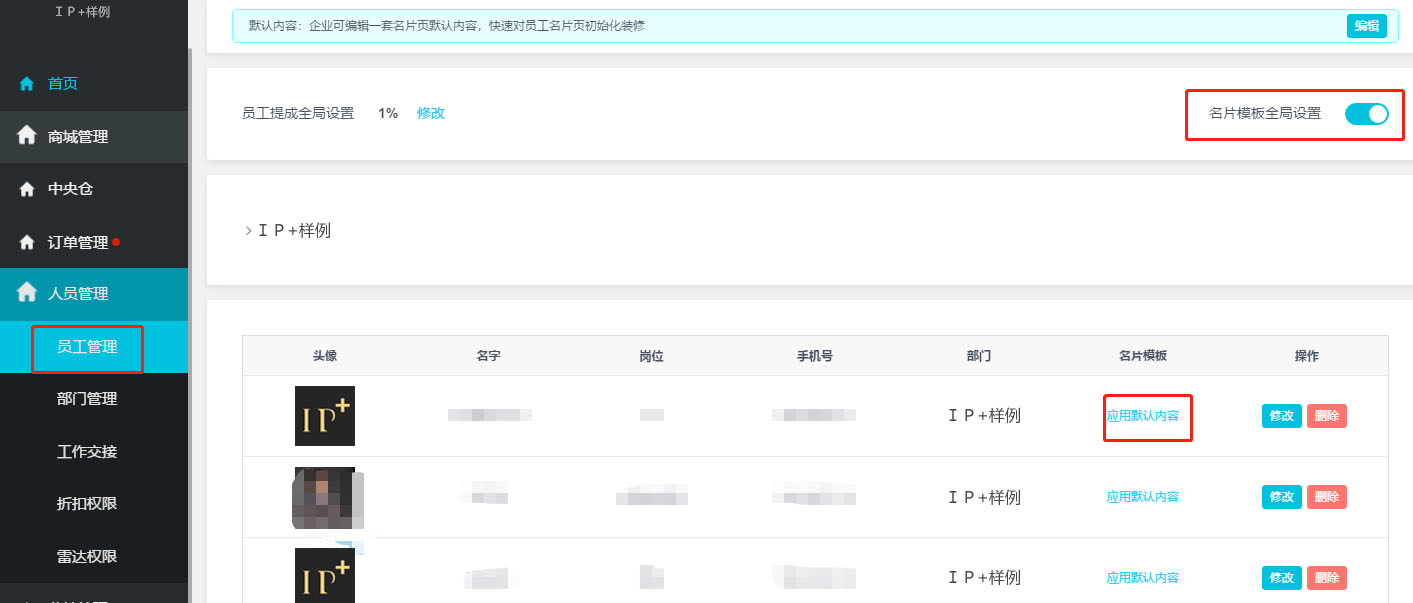 首先需要先將 【名片模闆全局設置】 按鈕打開,然後其中一位員工點擊 【應用默認內容】 。