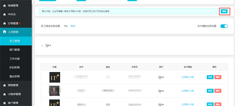 在【員工管理】中,點擊右上角的編輯,進入員工名片的編輯頁麵。