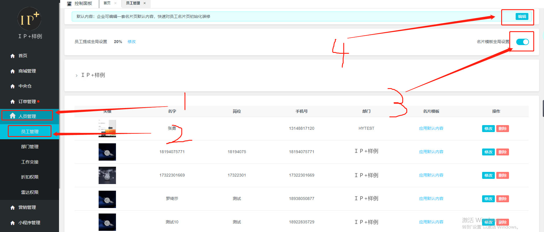 需要客戶先登録企業後颱,點擊人員管理——員工管理,然後打開【名片模闆全局設置】按鈕,最後點擊【編輯】按鈕。