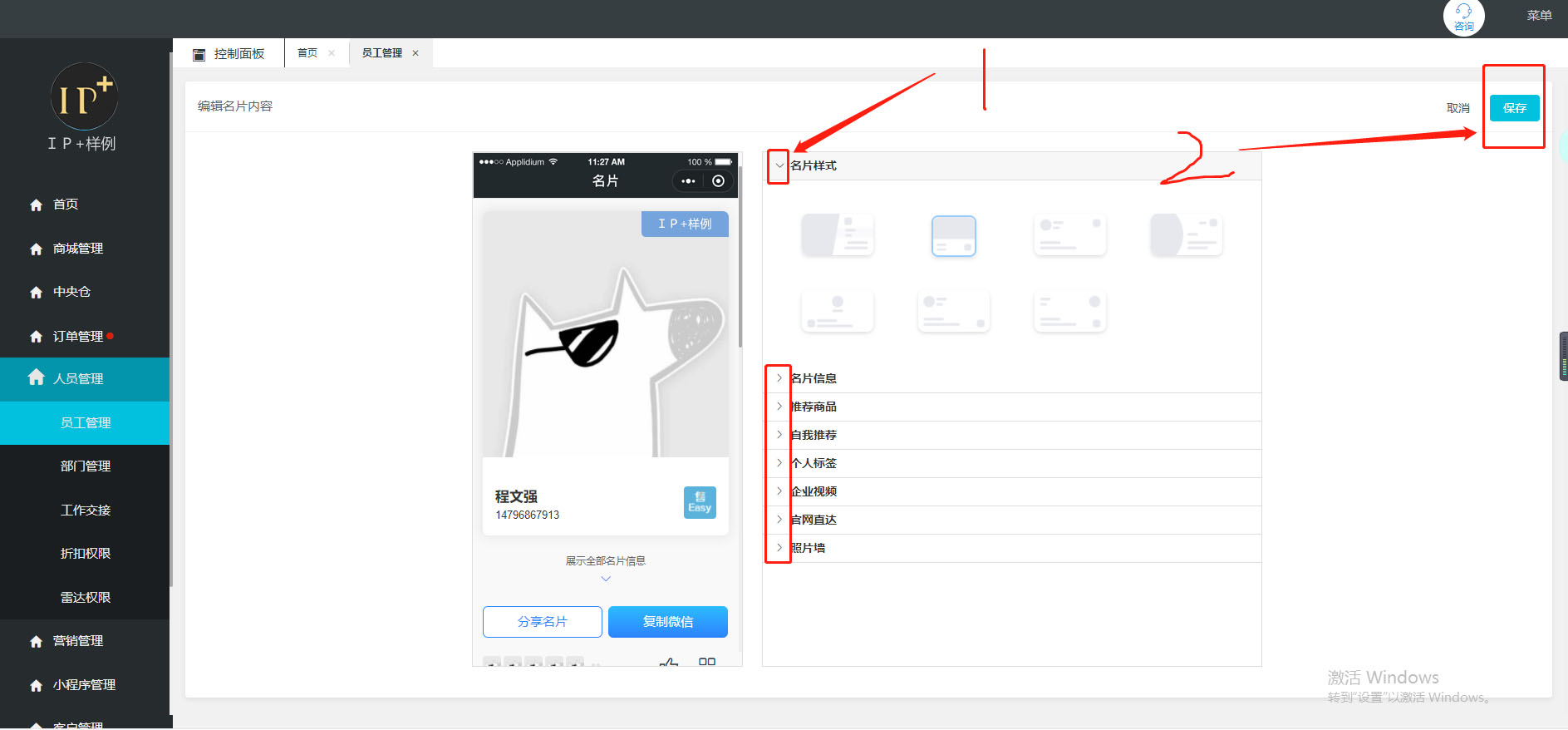 進入編輯頁麵後可以對名片樣式、名片信息、推薦商品等功能進行統一的設置。