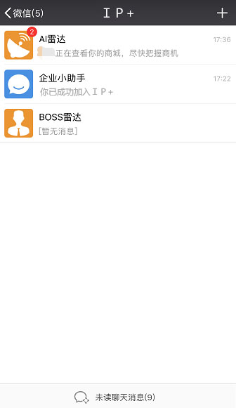 自己所屬公司的企業號會收到客戶操作行爲消息推送,點擊消息推送進入AI雷達,在底部導航【雷達】裡查看所有客戶的操作行爲;