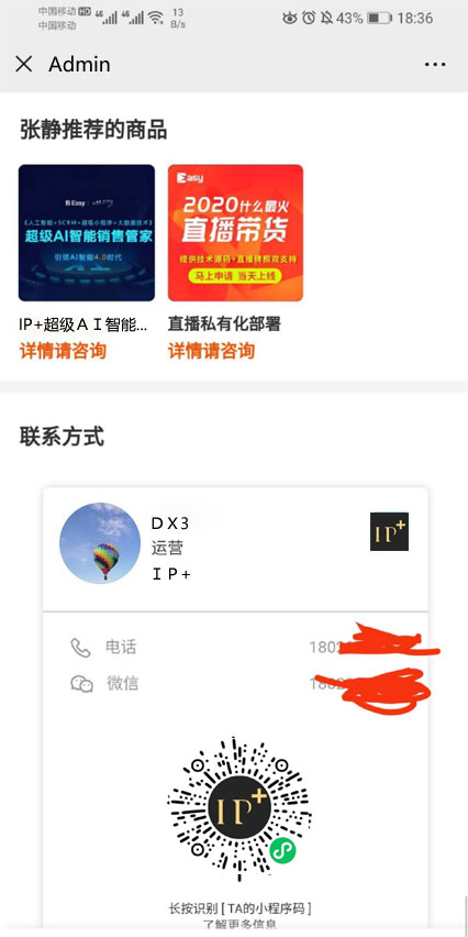 名片的信息,點擊電話可進行撥打,點擊微信可以複製到粘貼闆,長按二維碼可以識彆小程序。