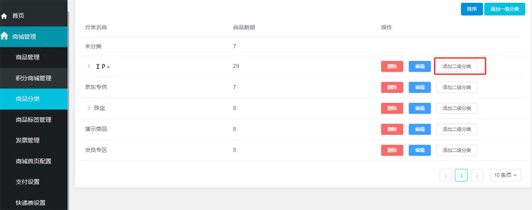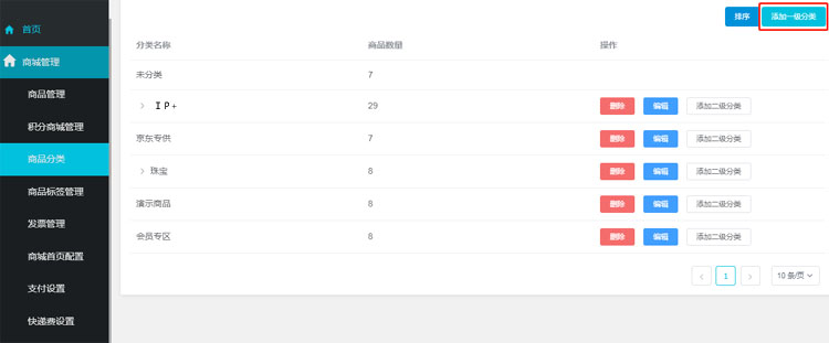 在【商城管理】——【商品分類】中,點擊【添加一級分類】按鈕,開始添加商品分類。