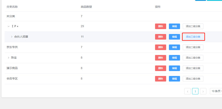 點擊【添加二級分類】,可以添加一級分類下麵的次級分類。 展開二級分類後,也可以進行三級分類的添加。