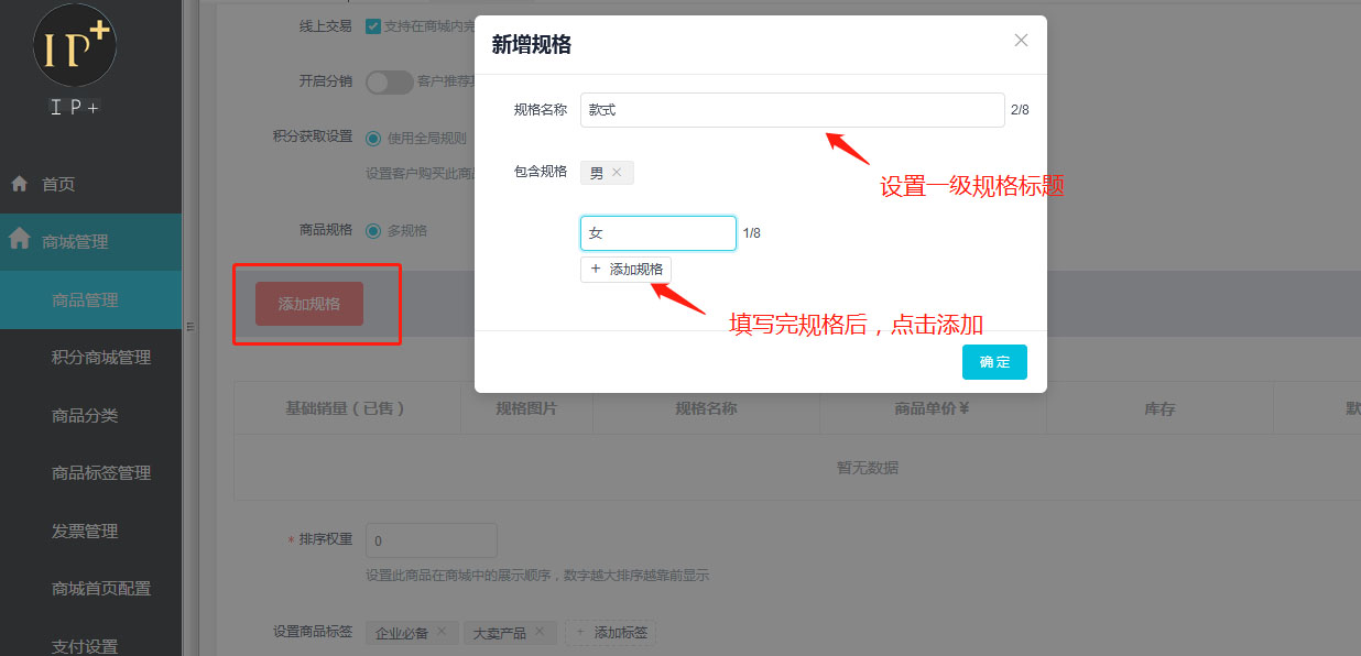點擊紅色【添加規格】按鈕,設置一級規格的名稱,填寫完成後點擊保存。