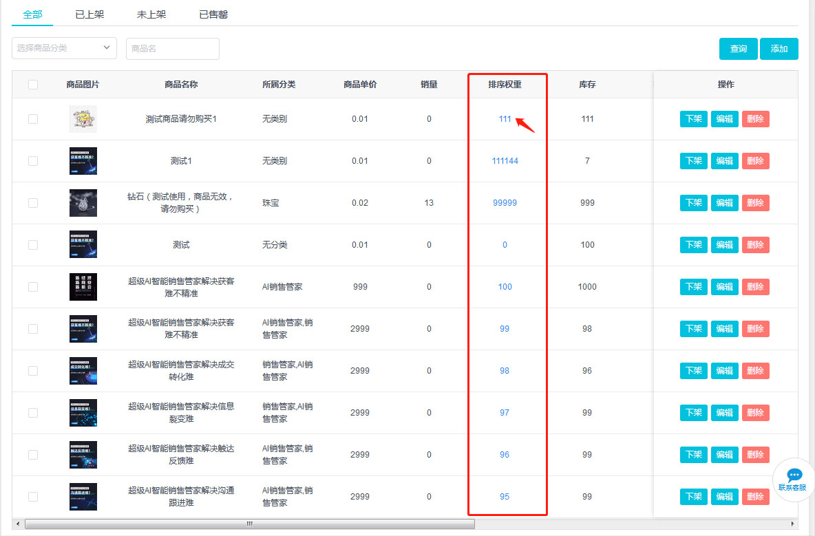 在【商城管理】--【商品管理】中,輸入數字進行排序(數字越大則越靠前,如果數字相衕則按時間排列,最後上傳的排前麵)