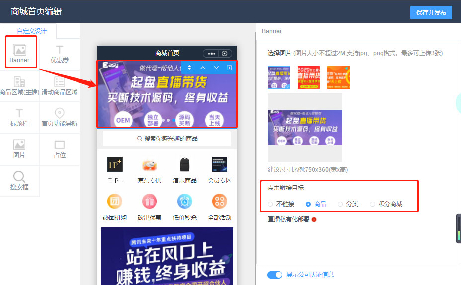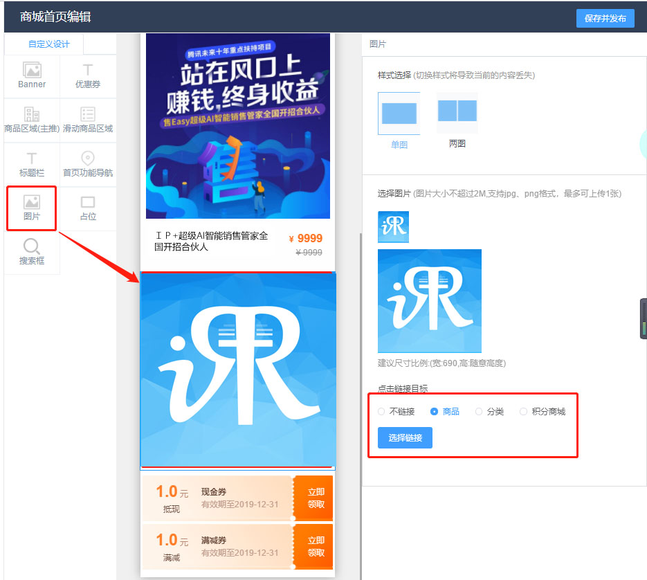 經過多次優化後再商城首頁配置的地方可以放置單張圖片,尺寸不限,併且可以鏈接商品和商品分類以及積分商城。
