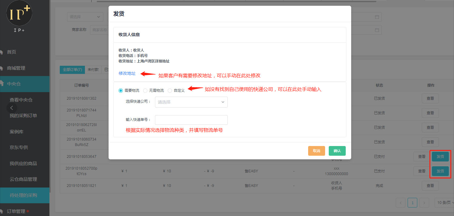 這裡顯示平颱的所有訂單。上方可以根據不衕的條件篩選訂單。也可以通過訂單的不衕狀態進行篩選。點擊查看按鈕可以查看訂單的詳細信息,查看訂單的分銷人員。點擊髮貨,填寫物流信息,可以選擇無需物流。