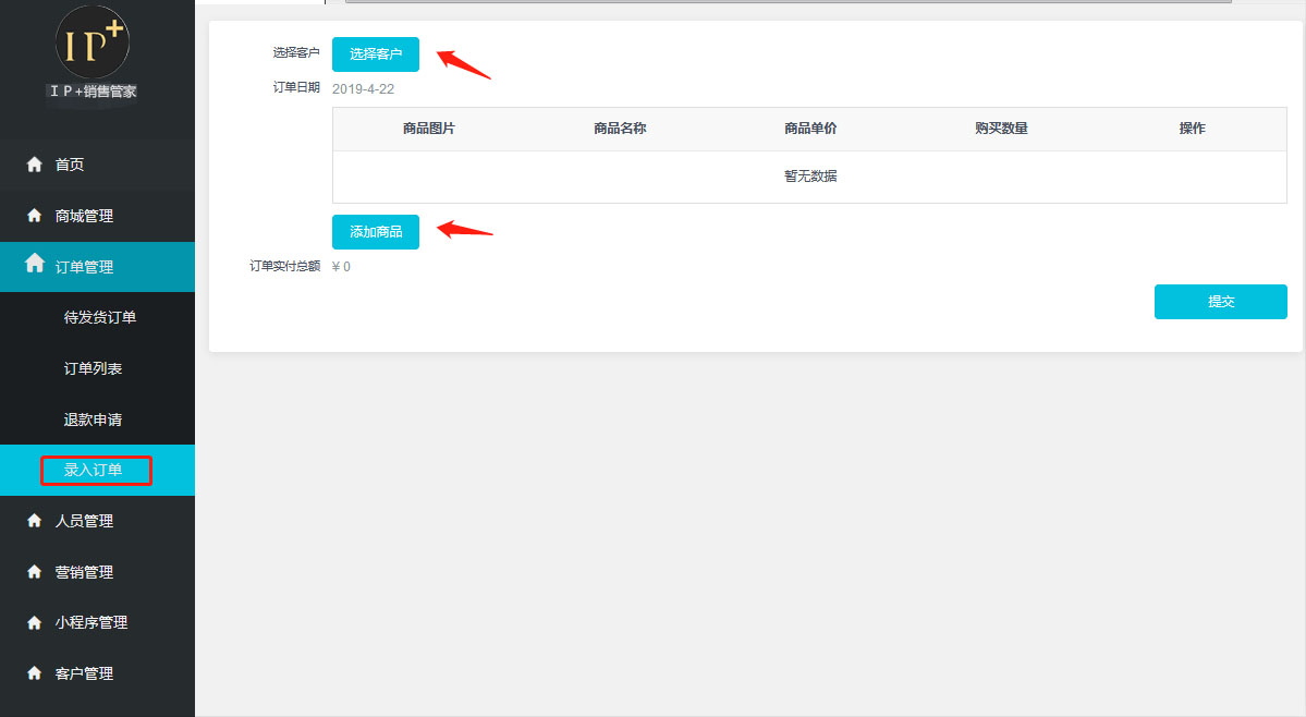 線下的訂單如果要録入到線上的繫統需要此用戶是線上商城名片的用戶纔可以,選擇用戶後再去選擇其商品信息,填寫訂單信息卽可録入繫統,録入成功之後時候如果相應的商品有開啟增值金,則需要在客戶賬戶的名下生成增值金以及質保單。