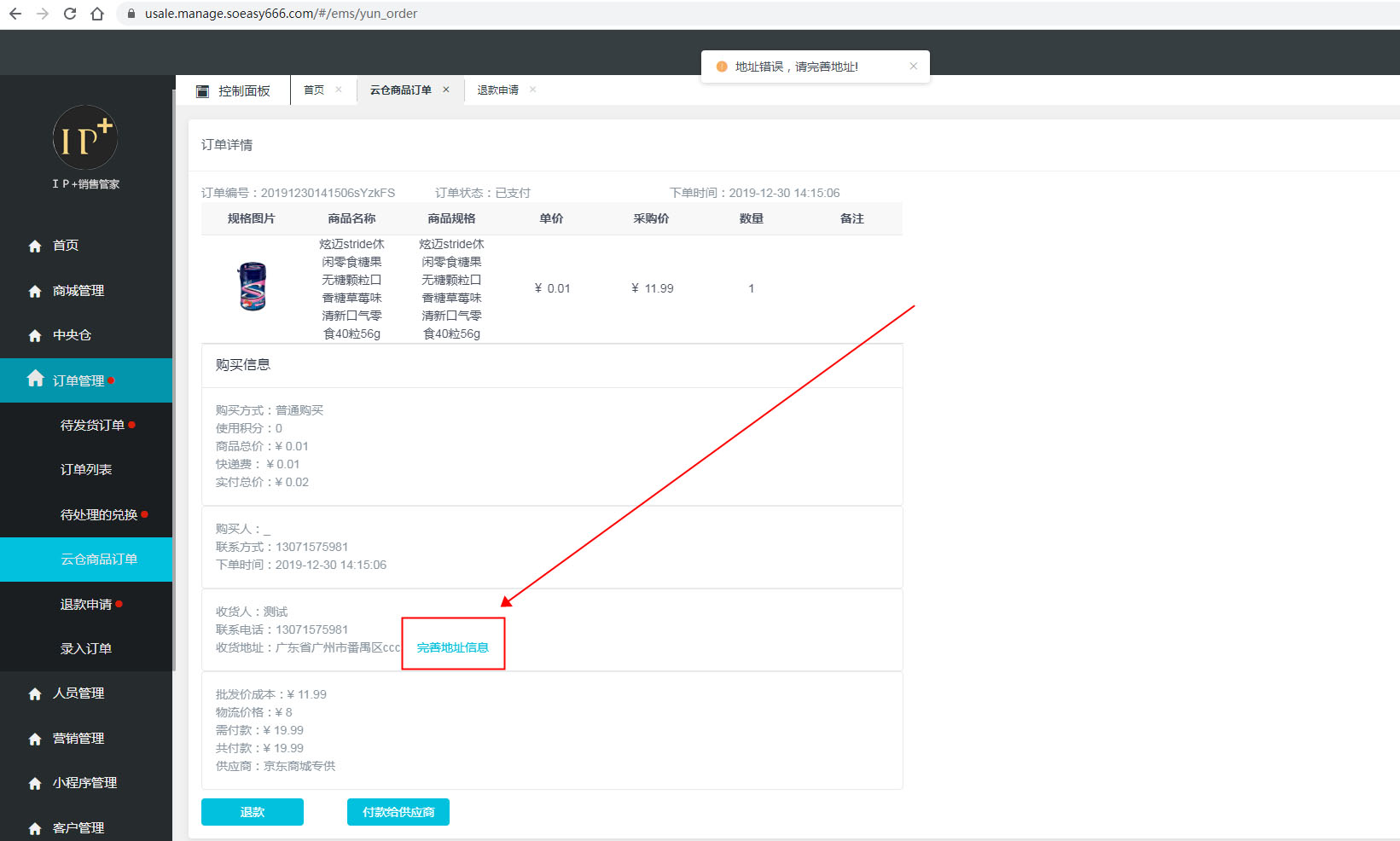 然後需要點擊【取消】支付,迴到訂單頁麵,點擊【完善地址信息】再次付款卽可。