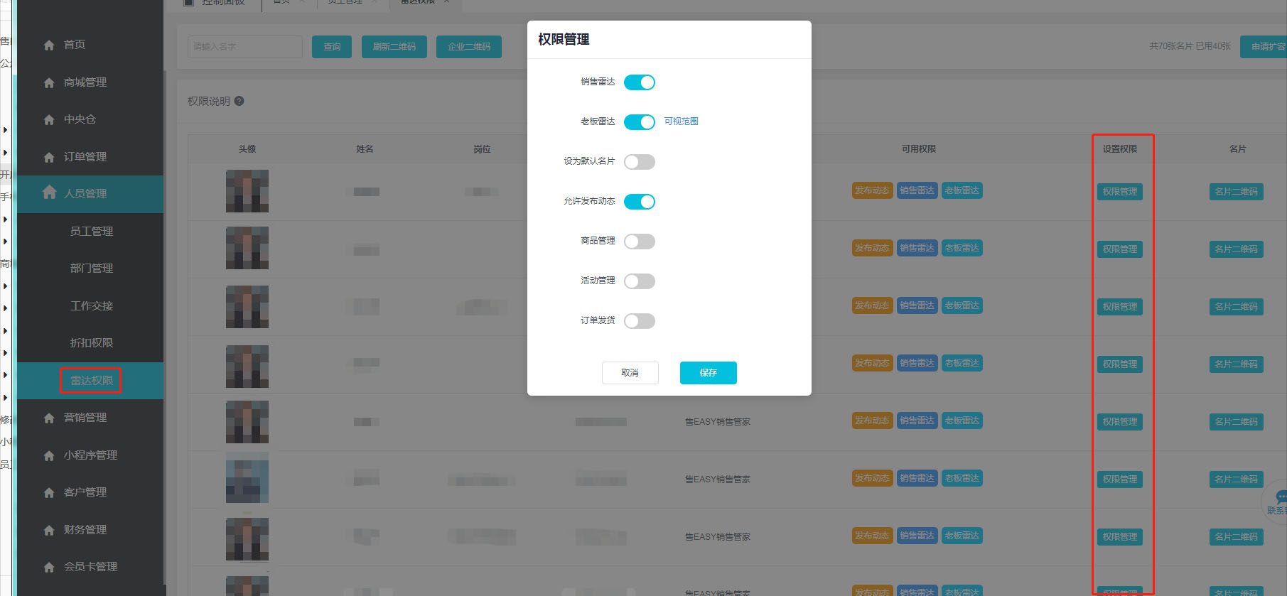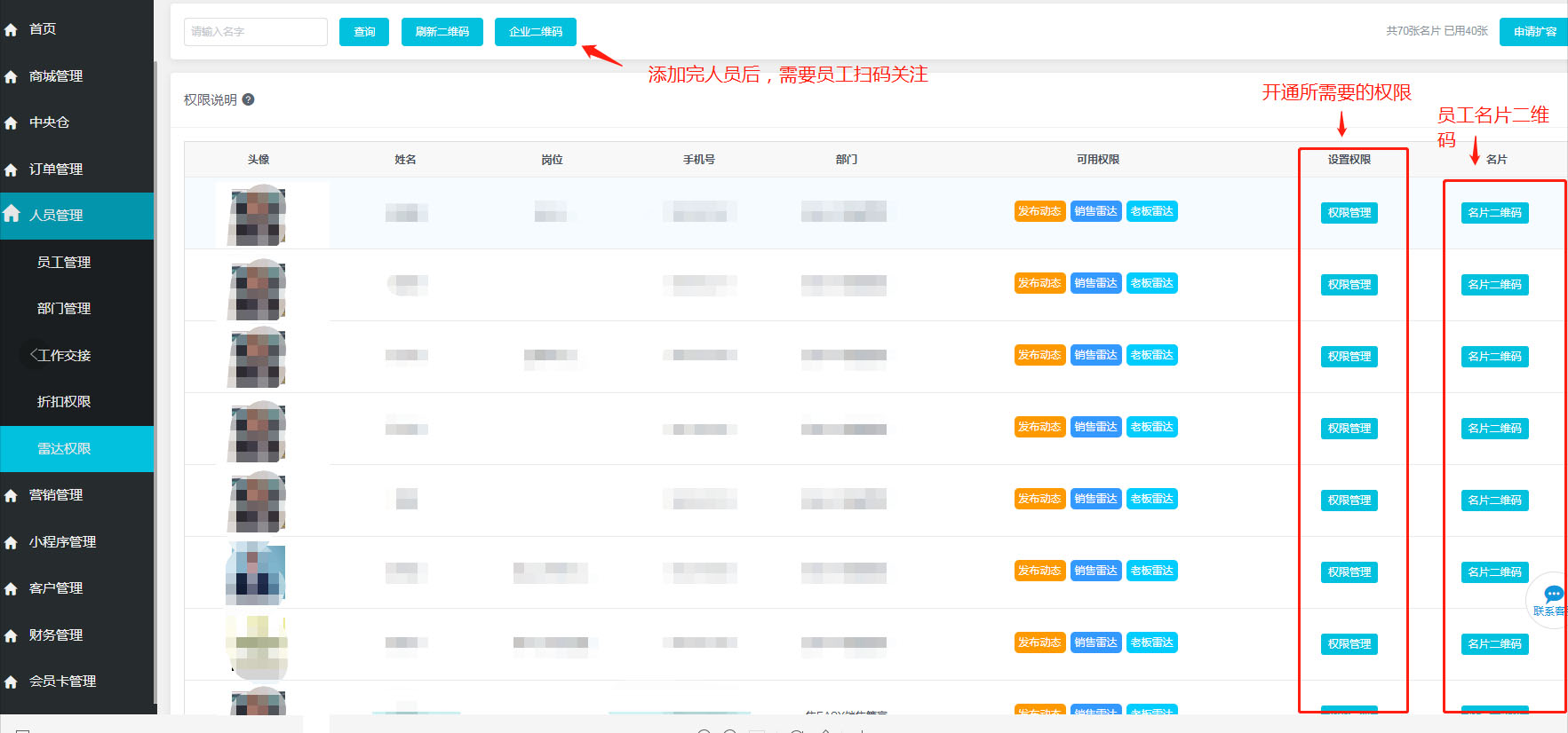 新增後,名片二維碼自動生成,可以在【人員管理】--【雷達權限】查看員工的名片二維碼。