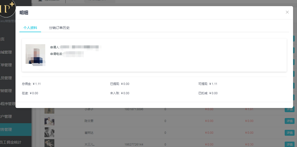 點擊詳情進入,可以查看此用戶的箇人資料和分銷訂單歷史。
