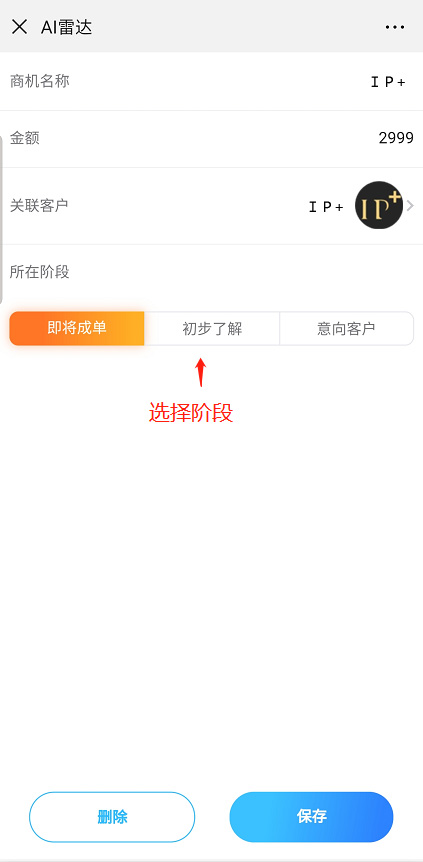 設置完成後點擊保存,然後進入AI雷達,點擊下方的工作颱,選擇商機進行商機階段的設置。