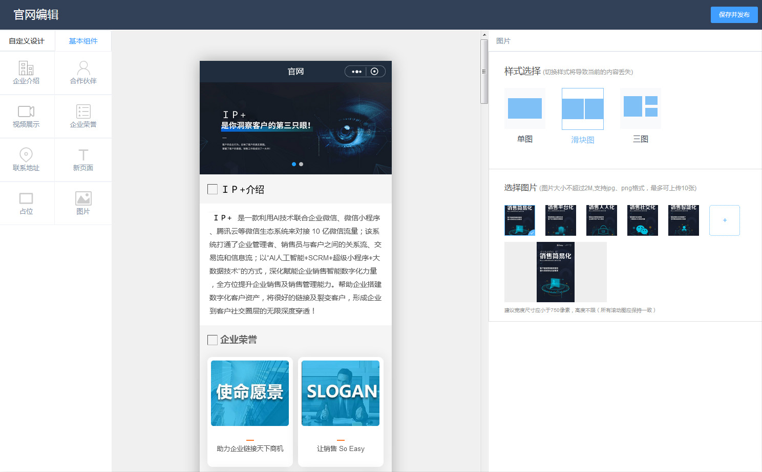 圖片模塊有三種樣式可供選擇,單圖、滑塊圖和三圖,圖片模塊自適應上傳圖片的比例。滑動圖片與輪播圖不衕,在前端需要客戶手動滑動圖片。