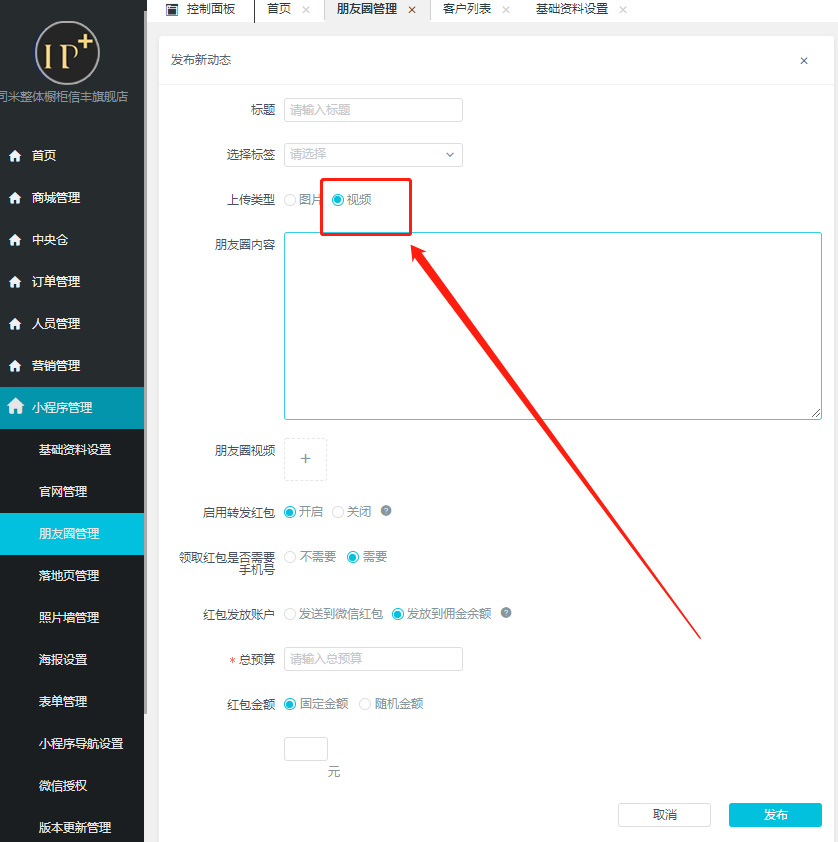 然後可以編輯視頻的文案,然後還可以選擇是否開啟轉髮得紅包的功能。信息填寫完整後點擊右下角的髮佈卽可