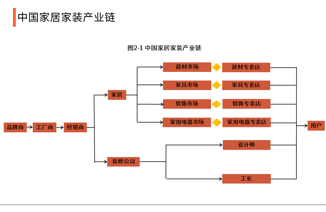 傢居傢裝市場現有産業鏈蔘與者包括品牌商、工廠、傢居專賣店市場、裝修公司、設計師、工長和傢居傢裝用戶等。