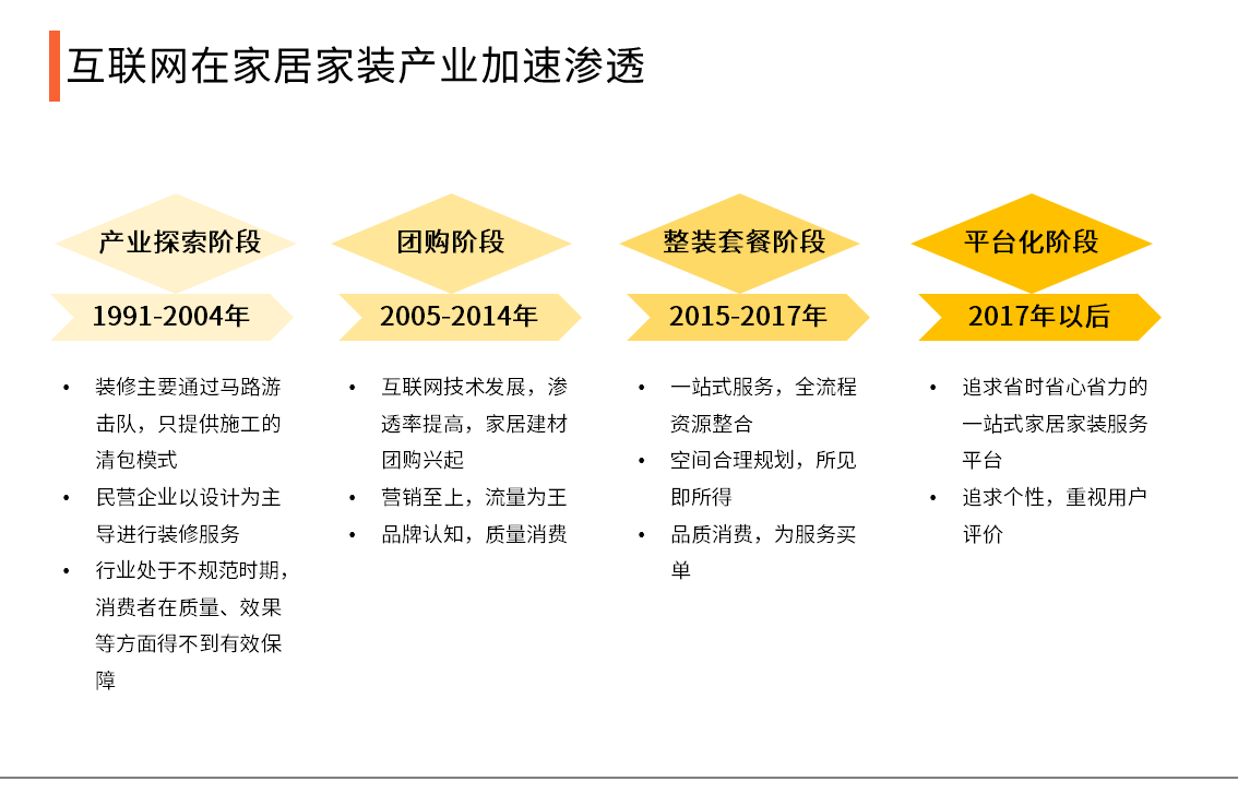 伴隨著互聯網在傢居傢裝産業的加速滲透,整箇傢居傢裝産業從最初的産業探索階段,經歷瞭糰購階段、整裝套餐階段,平颱化正逐步興起。