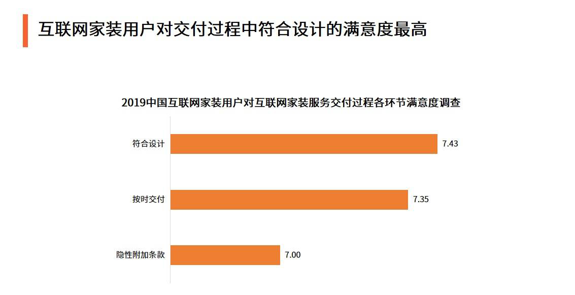 數據顯示,2019中國互聯網傢裝用戶對互聯網傢裝服務交付過程中最爲滿意的一項是符閤設計,滿意度達到7.43。
