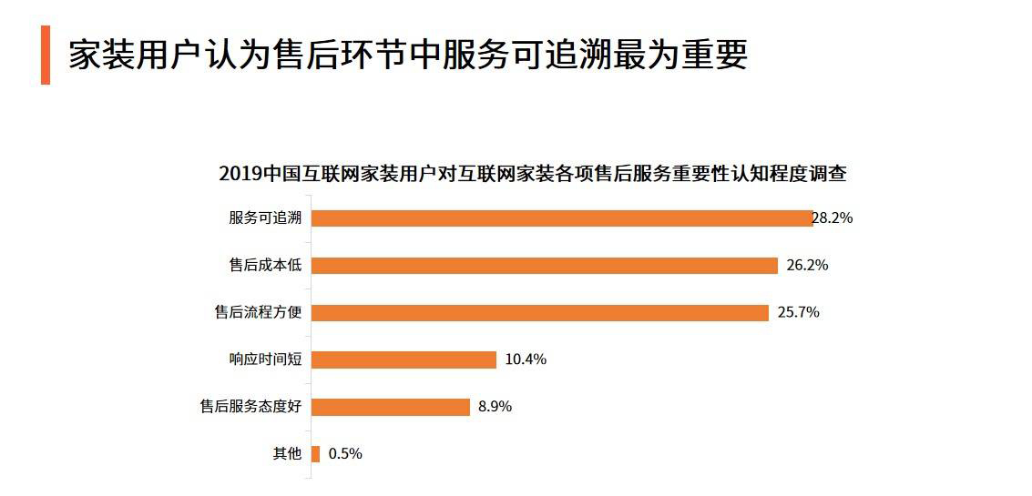 數據顯示,互聯網傢裝受訪用戶認爲售後服務最重要的是當用戶和傢裝齣現糾紛時,可以通過傢裝平颱對服務全流程進行查詢。由於傢裝屬於低頻高客單價的服務,用戶非常重視傢裝服務的可追遡性。相較於傳統的傢裝企業,互聯網平颱可以通過構建訂單追蹤繫統完善服務可追遡性,提高用戶的權益保障。