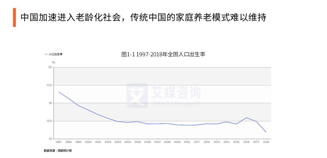2018年,中國60𡻕以上老年人數量已達2.22億,佔總人口的16.1%,大大超過國際的老齡化社會標準(60𡻕以上的人口佔總人口比例達到10%),説明中國已經進入深度老齡化社會。與髮達國傢相比,中國進入老齡化社會的週期特彆短,麵對的問題也癒加嚴峻。中國人口齣生率日益降低,2018年達到史上最低的10.9%,婦女的生育率徘徊在1.6的低位,大大低於2.1的生育更替率。“老齡化”和“少子化”雙重趨勢的疊加,使傳統中國的傢庭養老模式難以維持。