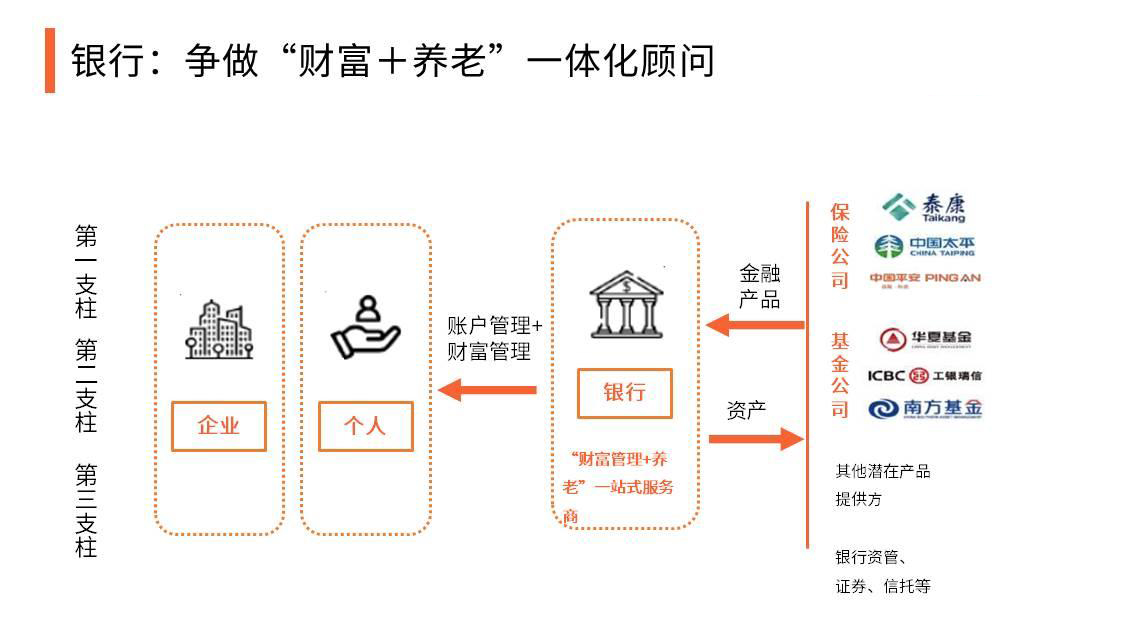 與保險和基金公司相比,銀行在其渠道佈局、客戶資源、品牌信譽等多方麵具有天然優勢,已經成爲零售金融市場最重要的流量入口。併且銀行在三大支柱業務中都承擔瞭賬戶管理人的角色,雖然業務介入深度不衕,但聚集瞭大量用戶。