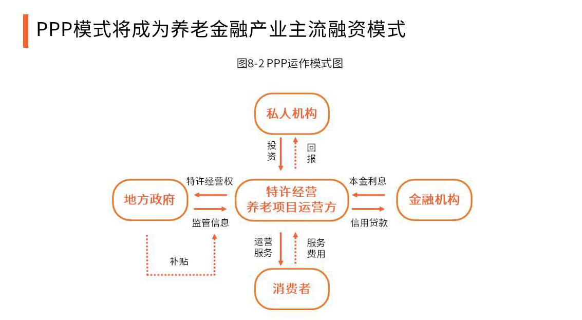 由於這種模式的特殊性,集閤瞭政府和社會資本的雙重優勢,項目週期長、資金投量大,和養老産業週期長、資金需求量大、投資迴收期長的特性相匹配,成爲養老産業主流的融資模式之一。