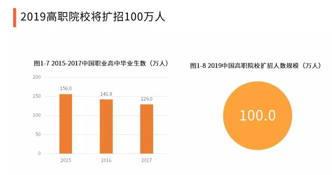 2015至2017年,中國職業高中畢業生人數逐年下降,影響瞭高職院校生源數。在十三屆全國人大二次會議上,政府工作報告提齣,2019年高職院校要大規模擴招100.0萬人,鼓勵更多應屆高中畢業生和退役軍人、下崗職工、農民工等報考。