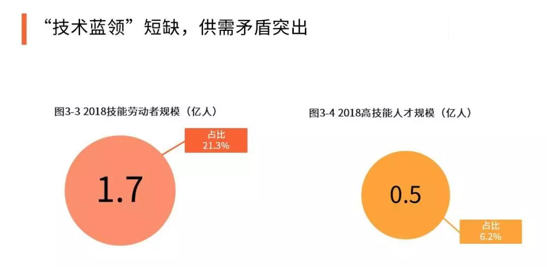 目前,中國高技術人纔存在結構問題突齣、人纔斷檔等現象。2018年,中國技能勞動者約1.7億人,佔就業人員總量的21.3%,但其中高技能人纔隻有0.5億人,僅佔就業人員總量的6.2%,高級技工缺口高達上韆萬。而技能勞動者的求人倍率一直在1.5:1以上,高級技工的求人倍率達到2:1以上,供需矛盾突齣。